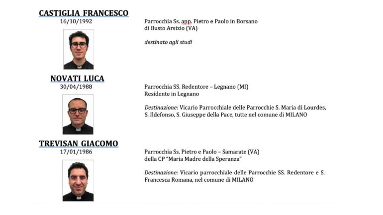 • NOVATI  LUCA  30/04/1988     Parrocchia SS. Redentore – Legnano (MI)   – Residente in Legnano – Destinazione: Vicario Parrocchiale delle Parrocchie S. Maria di Lourdes, S. Ildefonso, S. Giuseppe della Pace, tutte nel comune di MILANO