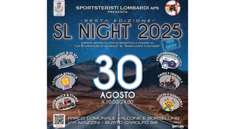 SL NIGHT 2025 riaccende i motori della generosità: raccolta fondi per pazienti oncologici e bambini affetti da malattie rare. Torna la passione su due ruote e la solidarietà nel cuore del territorio: sabato 30 agosto 2025 dalle 10 di mattina fino a mezzanotte, il Parco Comunale Falcone e Borsellino di Busto Garolfo accoglie la sesta edizione di SL NIGHT, l’evento motociclistico benefico organizzato dagli Sportsteristi Lombardi aps, che vede la Bcc di Busto Garolfo e Buguggiate in prima linea tra gli sponsor. Dopo un anno di pausa, la manifestazione riparte con il motto “We’re Back!”, un grido di entusiasmo che unisce centauri e famiglie in una giornata di festa, amicizia e impegno per il sociale. L’ingresso è gratuito e aperto a tutti, motociclisti e non.