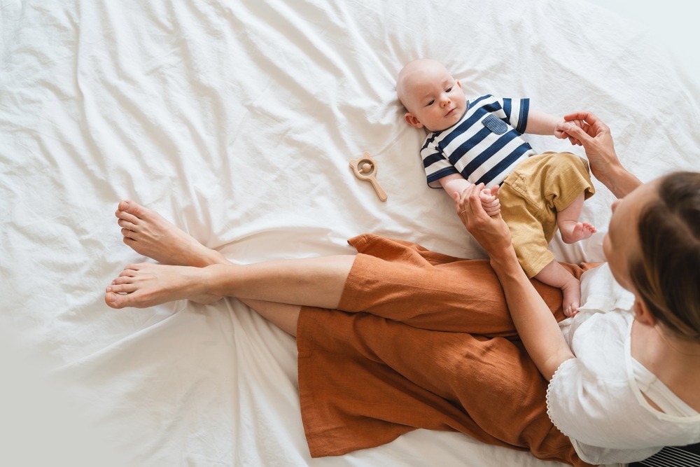 Happy,Mother,And,Baby,Relaxing,On,White,Bed.,Loving,Mother