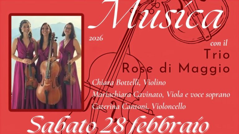 Sabato 28 febbraio suonerà il Trio Rose di Maggio, tre musiciste varesine – Chiara Bottelli (violino), Mariachiara Cavinato (viola e voce, soprano lirico) e Caterina Cantoni (violoncello) – che portano in scena un progetto dal respiro ampio: un trio d’archi “con l’anima di un quartetto”, grazie alla presenza della voce che aggiunge una dimensione in più, teatrale ed emotiva. Il programma, intitolato “Note di classica e cinema”, intreccia pagine della tradizione e grandi colonne sonore: da Boccherini e Shostakovich fino a Morricone, Zimmer e Sakamoto, senza rinunciare a medley e brani amatissimi dal pubblico, tra pop d’autore e suggestioni mediterranee.