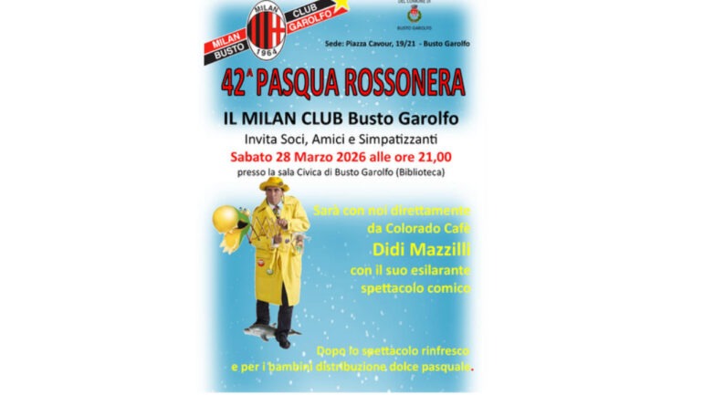 L’appuntamento è fissato per sabato 28 marzo alle ore 21 nella Sala Civica della Biblioteca di Busto Garolfo, in via Magenta, 25, dove il Milan Club invita soci, amici, associazioni sportive locali con i loro piccoli atleti e simpatizzanti a partecipare alla 42ª edizione della Pasqua Rossonera. L’evento è realizzato con il patrocinio del Comune e il sostegno della Bcc di Busto Garolfo e Buguggiate e il cuore grande di tutti i volontari del Milan Club.