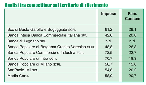 Un punto in più per la nostra Bcc anche nell’indice di cross selling, che misura la capacità di servire più esigenze dello stesso cliente, e che viene misurato sul numero di prodotti e servizi detenuto dalla clientela. A fronte di una media lombarda del 2,15, la Bcc di Busto Garolfo e Buguggiate fa segnare un 2,25, con una punta positiva sempre nel settore delle imprese, dove facciamo segnare un 2,28 contro la media lombarda dell’1,99. Decisamente interessanti i dati della nostra Bcc se confrontati con i competitor, ovvero con gli altri istituti di credito presenti sul nostro territorio. Come emerge dalla tabella qui sotto, che analizza i prestiti per controparte, si vede che su 7 competitor territoriali presi in considerazione (da notare che la Legnano non ha rilasciato alcun dato), la nostra Bcc si trova al terzo posto per quanto riguarda i prestiti alle imprese e al primo posto nei rapporti con i privati. “Da questa analisi emerge un quadro più che positivo della nostra banca -è il commento del direttore generale, Gianni Macchi-, ma questo non ci può e non ci deve bastare. Il nostro compito è fare sempre meglio, consolidando le posizioni e rappresentando per il territorio un partner di valore”.