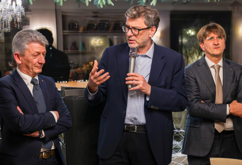 Dentro questa cornice, è arrivato il primo intervento del ministro dell’Economia Giancarlo Giorgetti. Lo ha detto subito, con una delle sue frasi che spostano il clima senza appesantirlo: per lui questi incontri sono utili perché lo aiutano a “toccare concretamente la realtà” fuori dai luoghi abituali del ministero. E poi ha citato, con ironia, il rating atteso in serata: una specie di esame che non finisce mai, la verifica continua della credibilità del Paese. «Voglio puntualizzare una cosa sul perché sono venuto -ha aggiunto Giorgetti-. Normalmente non sono solito partecipare alle cene organizzate da un’azienda o da un istituto. Se ho fatto un’eccezione -al di là della comodità logistica, visto che siamo a duecento metri da casa mia- è perché, quando si parla di istituti di credito, dobbiamo dircelo chiaramente: le banche non sono tutte uguali. È la logica del lungo termine che dovrebbe guidare l’erogazione del credito. Ma così spesso non è e il sistema sta diventando sempre più sbilanciato. E siccome, purtroppo, la regolamentazione europea tende a preservare questo modello, abbiamo sempre meno banche attente alla loro missione originaria: finanziare l’economia reale. il Credito Cooperativo rappresenta oggi l’ultima forma sopravvissuta del modo corretto di fare banca. Se potessimo riavvolgere il nastro di un secolo, troveremmo molte vere banche popolari e casse di risparmio; oggi di quel mondo è rimasto poco o nulla. L’unica realtà ancora profondamente radicata nel territorio è quella delle Bcc. Non lo dico per fare uno spot pubblicitario al presidente Scazzosi, ma perché questa è la realtà. E magari molti di voi l’hanno anche già sperimentato. E non serve nemmeno tornare indietro di cent’anni. Quando andavo a scuola io a Varese, si passava davanti al Credito Varesino, si girava l’angolo e c’era la Popolare di Varese, e di fronte la Banca di Desio e così via. Oggi non c’è più nulla di tutto questo. Per fortuna che ci siete voi».