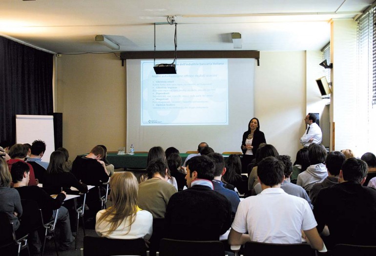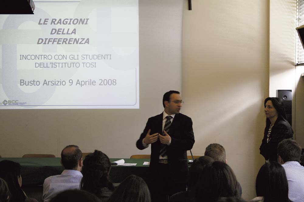 Come nasce uno spot? Quali obiettivi si pone? A queste e ad altre domande hanno risposto Maria Barbara Testa e Simone Mantovani, rispettivamente responsabili del Marketing e delle Relazioni esterne della nostra Bcc, durante l’incontro con gli studenti dell’Itc “Enrico Tosi” di Busto Arsizio. Mercoledì 9 aprile, infatti, la nostra Banca è “salita in cattedra” per una lezione di marketing promossa dall’istituto tecnico commerciale. «Sono state le caratteristiche della banca stessa che ci hanno spinto a chiedere un loro intervento», ha spiegato Rosaria Ramponi, responsabile delle relazioni tra scuola e mondo del lavoro dell’Itc di Busto Arsizio. Il tema su cui la nostra Bcc è stata chiamata a presentare una relazione era «Com’è cambiato il rapporto tra clienti e banche. E una dimostrazione concreta di queste evoluzioni sono gli spot pubblicitari». Una cinquantina gli alunni delle classi quarta e quinta del corsi di “Comunicazione e marketing” e gli studenti del corso post diploma Ifts (Istruzione formazione tecnica superiore) che hanno seguito con attenzione le due ore di lezione. Dai cambiamenti che la comunicazione degli istituti di credito ha subito negli ultimi otto anni, fino al claim che ha caratterizzato le ultime campagne pubblicitarie delle Banche di Credito Cooperativo. Il tutto per approdare a quel “Differenti per forza” che contiene mission e principi ispiratori degli istituti del Credito Cooperativo.