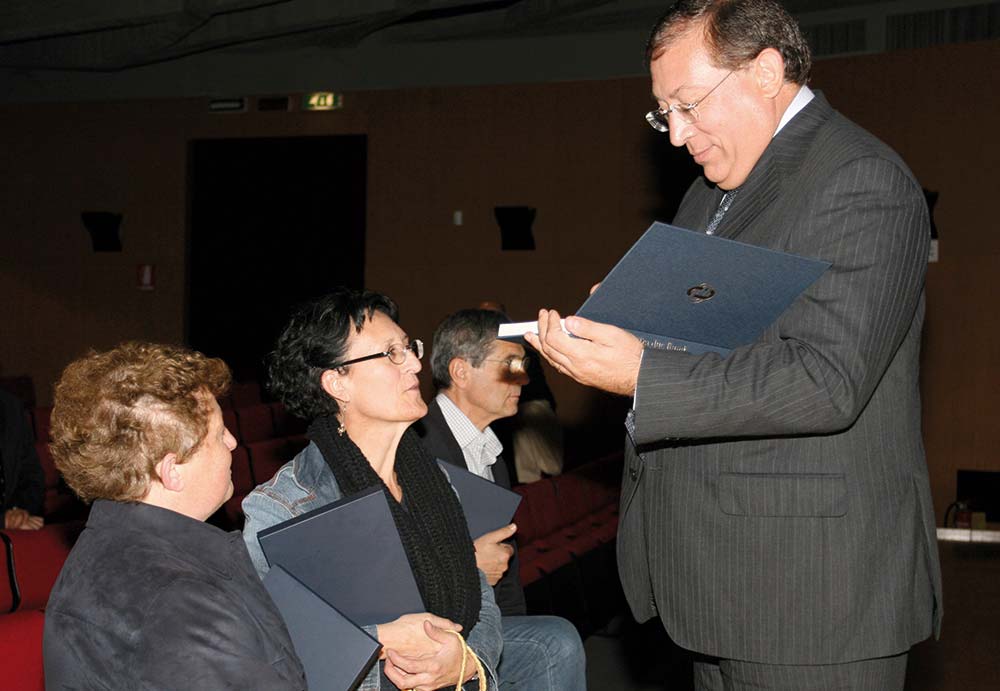 Lidio Clementi, presidente della Bcc, e Luca Barni, direttore generale, consegnano ai partecipanti del convegno “Tra due fiumi” un omaggio. Dall’alto, Clementi e Barni con Pietro Cafaro