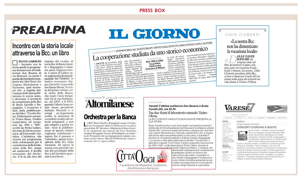 La seconda metà del XX secolo è quella in cui lo sviluppo ingrana le marce alte, le imprese sviluppano maggiori contatti e moltiplicano l’interdipendenza. Questo significa che, anche in ambito locale, perdono ogni senso i confini amministrativi, la rigidità di righe tracciate spesso senza alcun legame con la situazione reale dell’economia». Da qui ci si lancia nel cuore del secondo volume di “Tra due fiumi”, quello che arriverà a occuparsi dei giorni nostri, dalla crescita degli sportelli nei comuni limitrofi a Busto Garolfo alla sede attuale di via Manzoni, dalla fusione con l’omologa di Buguggiate all’unione delle aree, attraverso i diversi presidenti che si sono succeduti alla guida della Cassa prima e della ribattezzata Bcc in seguito.