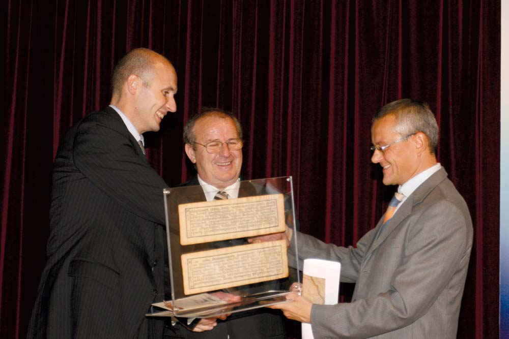 Lidio Clementi, presidente della Bcc, e Luca Barni, direttore generale, consegnano ai partecipanti del convegno “Tra due fiumi” un omaggio. Dall’alto, Clementi e Barni con Gianni Borsa