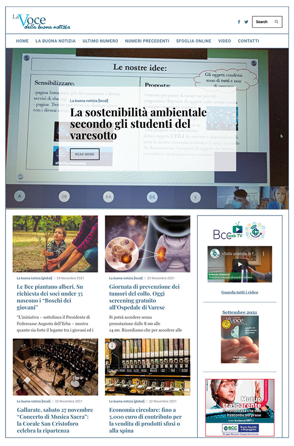 La Voce della buona notizia nasce ad aprile 2016 perché, come scrisse in quell’occasione il presidente della Bcc di Busto Garolfo e Buguggiate, Roberto Scazzosi: «Non si possono tacere i problemi e le crisi, ma è importante dare spazio a chi, questi problemi e queste crisi lavora per affrontarli, propone modelli di successo, crea buone pratiche utili da prendere a esempio. Mettere in circolo questi stimoli è importante per capire quale strada prendere per il futuro». Come ribadito esattamente tre anni più tardi, ad aprile 2019, da papa Francesco, in un messaggio a giornalisti ed editori: «Spero che nei vostri servizi non manchino mai le cose buone -sono le parole di papa Francesco-, le tante buone notizie che valgono la pena di essere raccontate e che danno speranza».