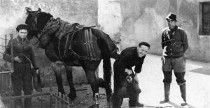 Sopra, nell’immagine di copertina la squadra al completo della “Buratti Davide”; qui sopra, l’azienda vista dall’alto e l’area magazzino con i materiali grezzi; più sotto, una foto storica di Davide Buratti intento a ferrare un cavallo e sotto il figlio Giuseppe Buratti nell’officina ormai dismessa del padre.