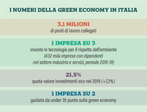 Quella che si coglie nell’ultimo rapporto GreenItaly è un’ulteriore accelerazione su questa strada. A dirlo sono i numeri: secondo la ricerca, nel settore dell’industria e dei servizi 432mila imprese con dipendenti, quasi una su tre, hanno investito nel periodo 2015-2018, o prevedono di farlo entro la fine dell’anno, in prodotti e tecnologie green per ridurre l’impatto ambientale, risparmiare energia e contenere le emissioni di CO2. Il 2019 ha fatto registrare il record di eco investimenti, che hanno raggiunto una quota valore pari al 21,5% (+7,2% rispetto al 2011), coinvolgendo oltre 300mila imprese. Non solo, nel 2018 la green economy ha fatto nascere oltre 100mila nuovi posti di lavoro, +3,4% rispetto al 2017: un incremento molto più alto rispetto ai posti di lavoro tradizionali, che sono cresciuti nello stesso periodo solo dello 0,5%. Così, il numero dei lavoratori “green” ha superato la soglia dei 3 milioni: 3.100.000 unità, il 13,4% del totale dell’occupazione complessiva (nel 2017 era il 13,0%).