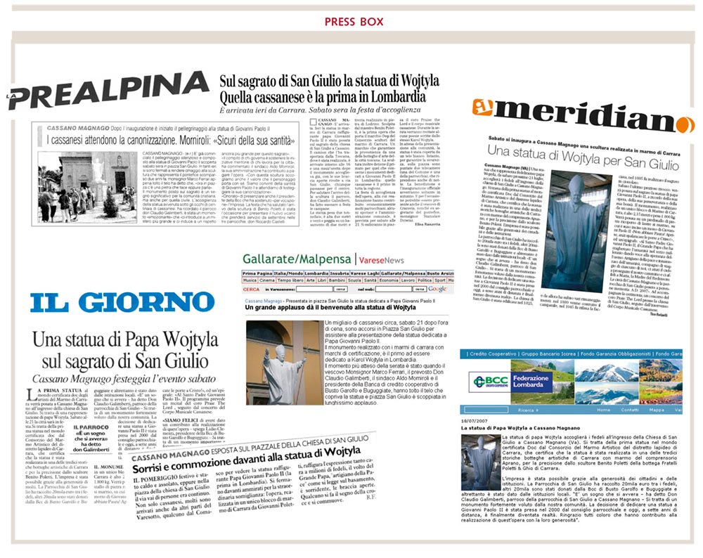 Quella posata a Cassano Magnago è la prima statua nel mondo “certificata doc” dal Consorzio del marmo artistico del distretto lapideo di Carrara, che certifica che la statua è stata realizzata con vero marmo di Carrara, estratto dalle cave delle Alpi Apuane in Lunigiana. Già probabilmente attive nella cosidetta “Età del Rame”, ovvero 3/4mila anni prima di Cristo, le cave toscane hanno conosciuto un incredibile sviluppo sotto l’impero Romano, i cui architetti e artisti chiamavano il marmo bianco di Carrara “marmor lunensis” e l’hanno reso universalmente noto come uno dei marmi più pregiati del mondo. Il marmo è una roccia metamorfica (“nasce”, grazie alle forti pressioni e alle alte temperature, dalla trasformazione delle rocce sedimentarie ed eruttive), composto prevalentemente di carbonato di calcio. Il basso indice di rifrazione della calcite, che permette alla luce di “penetrare” nella superficie della pietra prima di essere riflessa, conferisce a questa roccia una speciale e tipica luminosità. E questa caratteristica è accentuata soprattutto nel marmo bianco di Carrara, da sempre scelto per le opere più importanti e prediletto, ad esempio, dal celeberrimo artista e scultore Michelangelo Buonarroti.