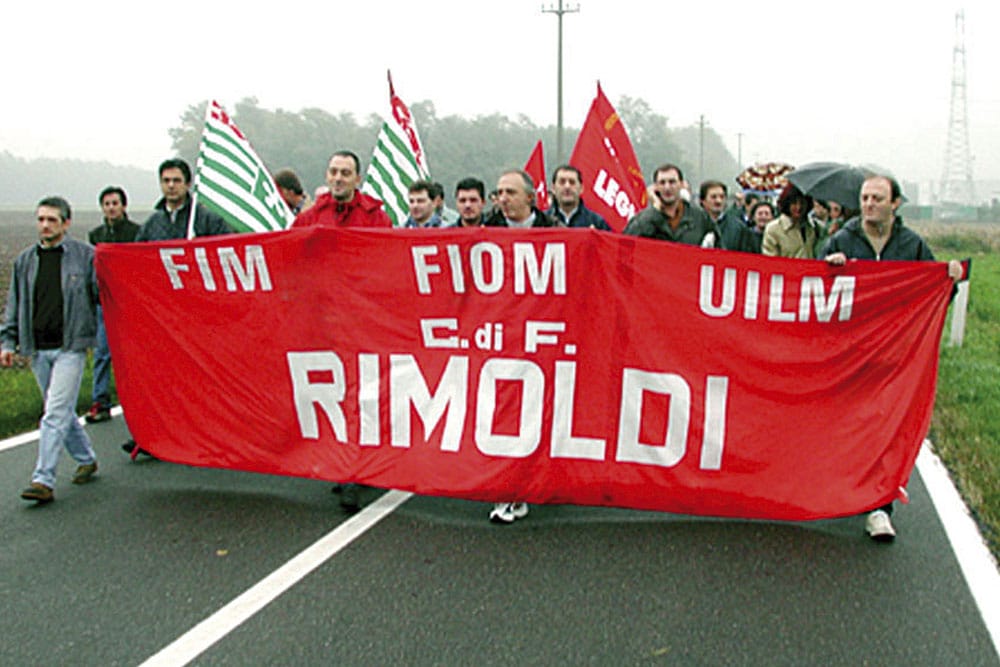 Operai di Rimoldi in sicopero durante la crisi che ha colpito la Rimoldi-Necchi di Olcella nell’ottobre 2002
