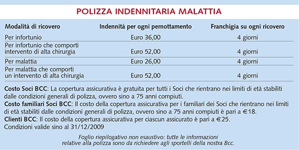 Più di mille clienti e oltre duemila Soci hanno sottoscritto la polizza indennitaria malattie messa a punto dalla nostra Bcc in partnership con la società Milano Assicurazioni. Numeri soddisfacenti che hanno spronato la direzione commerciale a rinnovare, anche per il 2009, la possibilità di sottoscrivere l’assicurazione. Nel dettaglio, hanno perfezionato la polizza indennitaria 2.208 Soci (per i quali, lo ricordiamo, la polizza è gratuita) e 1.004 clienti. Di questi ultimi, 123 hanno meno di 40 anni, 196 hanno un’età compresa tra i 40 e i 50 anni, 171 tra i 50 e i 60 anni e 513 hanno un’età superiore ai 60 anni, ma inferiore ai 75 (oltre quest’età, infatti, non è possibile stipulare la polizza). Nel corso del 2008, sono stati liquidati 80 sinistri per un totale di 40mila euro. Tutti i Soci di età inferiore ai 75 anni, come detto, mantengono per il 2009 la copertura gratuita; per i familiari dei Soci, il premio è di 18 euro annui (l’anno scorso era di 19 euro), mentre per i clienti del nostro istituto di credito il premio annuo è di 25 euro. Le modalità di adesione alla polizza sono rimaste invariate (chi l’avesse già sottoscritta otterrà il rinnovo in automatico) così come le indennità: per infortunio 36 euro a pernottamento; per infortunio che comporti interventi chirurgici 52 euro a pernottamento; per malattia 26 euro; per malattia che comporti interventi chirurgici 52 euro. In tutti i casi, la franchigia da applicare su ogni ricovero è di 4 giorni (nel box di questa pagina un prospetto dettagliato). La polizza ha la durata di un anno solare e le nuove condizioni sono valide a partire dal primo gennaio 2009. Tutte le informazioni, le modalità dettagliate dei contratti sono disponibili a ogni sportello della nostra Bcc oppure visitando il sito internet della banca all’indirizzo www.bccbanca1897.it.