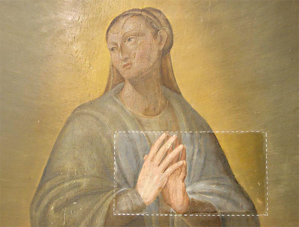 È a buon punto il restauro conservativo dell’antica Pala dell’Assunzione di San Giorgio su Legnano, intervento sponsorizzato interamente dalla nostra banca, con una donazione di 15mila euro alla parrocchia. Al Centro Restauro di Milano, hanno infatti terminato la pulitura e la stuccatura del dipinto, attribuito dalla Soprintenza alle Belle Arti di Milano alla scuola cremonese vicina a Bernardino Ciampi. Nelle foto riportate in questa pagina, si vedono alcune fasi dell’intervento di pulitura. Innazitutto la spugnatura, un procedimento che prevede l’utilizzo di piccole spugne impregnate di una speciale soluzione pulente, per togliere dalla superficie del dipinto i residui di polvere che, nel tempo, si sono stratificati. Ora comincia la fase forse più deli- cata del restauro: il ritocco delle lacune del dipinto, causate dalle cariature del colore, dovute sia all’attacco di insetti xilofagi, sia all’assestamento del legno della pala, che negli anni si è più volte espanso e poi ritirato a causa degli sbalzi di temperatura subiti. Le cadute del colore più frequenti, infatti, seguono le venature del legno su cui è stata realizzata l’opera. L’obiettivo è riportare l’immagine dell’Assunzione al suo antico splendore.
