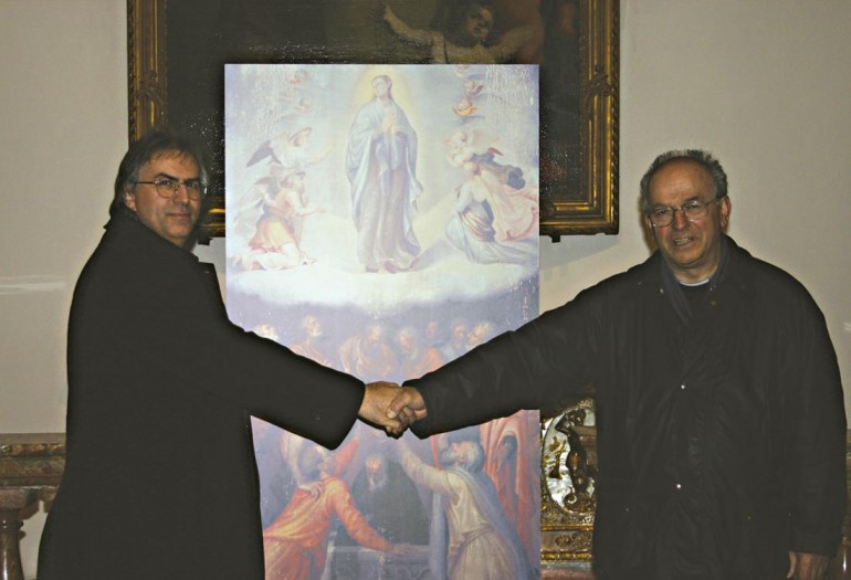 I fedeli di San Giorgio su Legnano e della zona attendono con ansia e curiosità il ritorno della Pala dell’Assunzione in parrocchia. La nostra banca, nel frattempo, ha messo a disposizione un totem con l’immagine sacra, che è stato posizionato nella chiesa parrocchiale, al posto dell’opera originale, in modo che l’immagine del dipinto sacro non venga sottratta all’adorazione dei fedeli. La consegna della gigantografia è stata fatta prima di Natale a don Luciano Premoli, parroco di San Giorgio su Legnano, da parte del nostro presidente Silvano Caglio. Nel frattempo, un’immagine della pala è stata posizionata anche sulla vetrina dalla nostra filiale di San Giorgio, a testimonianza dell’impegno che la banca profonde per il territorio e per la conservazione dei beni artistici.