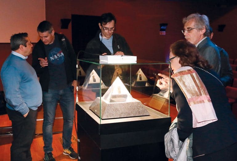 La Luna è arrivata in Don Besana. Domenica 7 maggio nell’auditorium della nostra Bcc è stato esposto un frammento di roccia lunare grazie al progetto “Ti porto la Luna” promosso da Luigi Pizzimenti, presidente di ADAA – Associazione per la Divulgazione Astronomica e Astronautica, e organizzato dal Gruppo di Ricerca Storica in collaborazione con il CAT Circolo Astrofili di Trezzano sul Naviglio e la NASA, e il supporto del Comune e della nostra banca. Oltre 600 persone si sono alternate nell’accurata visita del frammento del peso di 109 grammi raccolto dall’astronauta James Irwin durante la missione Apollo 15 nel 1971.