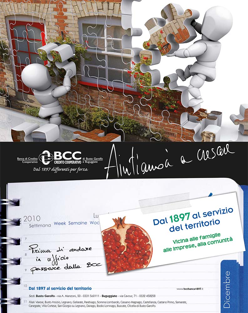 Si rinnova la campagna pubblicitaria della nostra Bcc. Nel corso del 2010, cieli azzurri, nuvole candide e agende giornaliere sono stati i simboli associati all’idea di una banca dal futuro sereno e vicina nel presente ai suoi investitori e correntisti; dagli ultimi mesi dell’anno e per buona parte del 2011 queste immagini lasceranno il posto a una figura che evoca il concetto del “costruire” -la propria casa, la propria azienda, ma anche il territorio- tassello dopo tassello, su basi sicure. Il messaggio è: chi si rivolge alla Banca di Credito Cooperativo di Busto Garolfo e Buguggiate non solo trova un sostegno per edificare il suo futuro su fondamenta solide, ma sa anche che la nostra Bcc reinveste i suoi utili in iniziative per lo sviluppo dell’economia locale. Perché è proprio questa una delle ragioni della “differenza” della nostra banca: la convinzione profonda che il benessere degli investitori, dell’istituto di credito stesso e dell’intero territorio siano inscindibili, parte di un sistema che funziona quando tutti sono in condizione di lavorare al meglio. Per questo, a rimanere immutato nella campagna pubblicitaria è il motto “Aiutiamoci a Crescere”, coniato ormai due anni fa, in un momento drammatico per l’economia mondiale e per il settore creditizio in particolare. In tempi tanto burrascosi, la nostra banca ha saputo tenere ben saldo il timone e non è mai venuta meno ai suoi principi ispiratori, riuscendo davvero ad “aiutare a crescere” le famiglie e le imprese con una serie di azioni concrete, capaci di rispondere alle loro esigenze e necessità. Nei prossimi dodici mesi le nuove pubblicità faranno conoscere nella zona dell’Alto Milanese e del Varesotto i prodotti studiati dalla nostra Bcc. Sono state pianificate infatti circa ottanta uscite (quattro al mese per i periodi fra novembre/dicembre 2010, febbraio/ marzo, maggio e settembre 2011) sulle più importanti testate locali: le pagine di economia della Prealpina e della Provincia di Varese, la terza pagina di Città Oggi, e le pagine “Primo Piano” del Giorno nelle edizioni di Varese e Legnano. Senza dimenticare internet: le pubblicità della nostra Bcc continueranno a comparire sui più importanti siti locali di news, primo fra tutti Città Oggi Web.